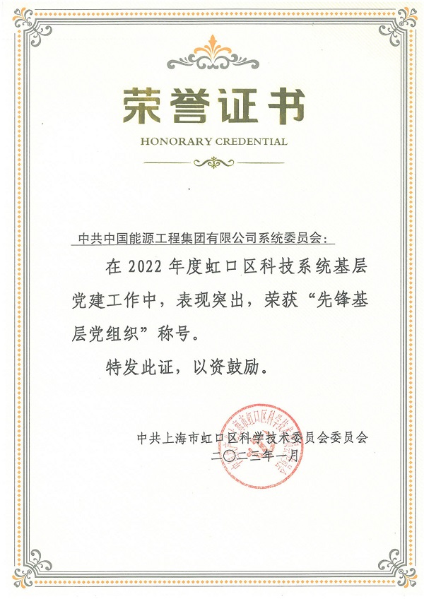 會(huì)議的最后,對(duì)虹口區(qū)科技系統(tǒng)基層黨建工作中表現(xiàn)突出的黨組織進(jìn)行了表彰,中國(guó)能源工程集團(tuán)有限公司系統(tǒng)黨委榮獲2022年度“先鋒基層黨組織”榮譽(yù)稱號(hào)。